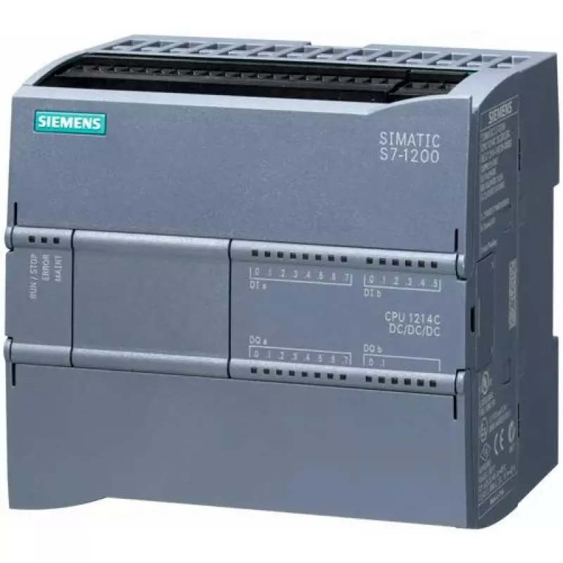 The S7-1200 CPU 1214C has 14 digital inputs, 10 digital outputs (relay type), and 2 analog inputs, all driven from a 24 V DC supply. It provides increased processing capacity and versatile communication capabilities, thus well suited for medium to sophisticated automation applications. The system is easy to expand based on modular structure through signal modules (SMs), signal boards (SBs), and communication modules (CMs) to suit specific industrial requirements.